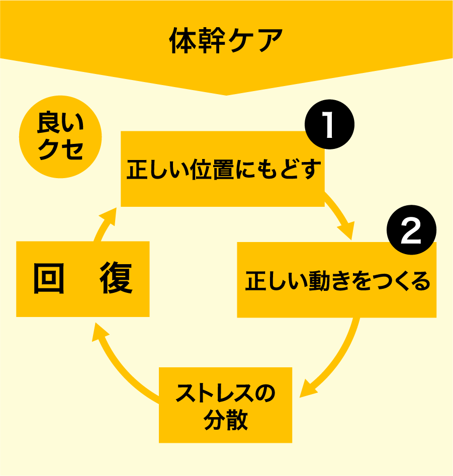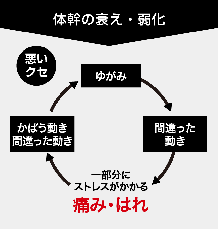 体幹機能が衰えることで、カラダはゆがみやすくなり、カラダにゆがみがあると無意識に間違った動きをしてしまい、その動きが悪いクセとして習慣化し、「いつも同じところが痛くなる」「いつまでも治らない」ということが起きてしまいます。
