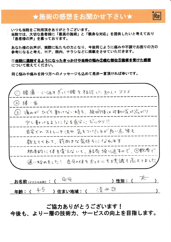 静岡市の海野接骨院+Rebodyではこのような施術でぎっくり腰を発生させている原因である、カラダのゆがみ・間違った動き・悪いクセを改善してぎっくり腰を早期改善し、正しい位置・正しい動き・良いクセを定着させることでぎっくり腰の再発予防までサポートさせて頂きます。