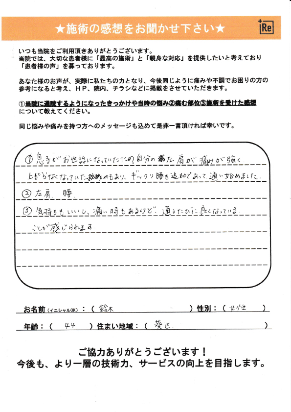 今後の施術方針や通い方、ご自宅での過ごし方、ホームエクササイズなどをアドバイスさせていただきます。