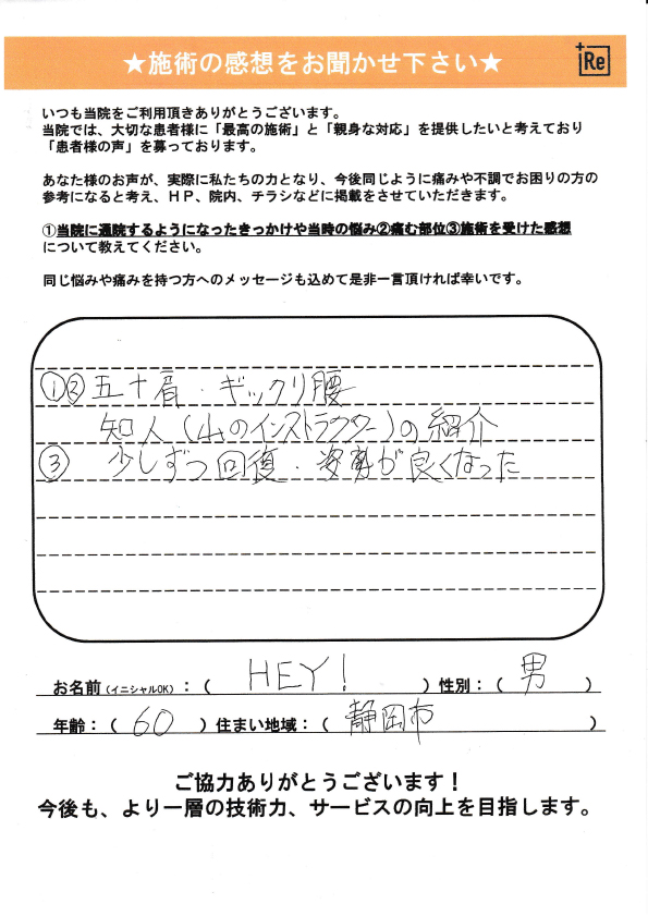 静岡市の海野接骨院+Rebodyではこのような施術で五十肩・四十肩を発生させている原因である、カラダのゆがみ・間違った動き・悪いクセを改善して五十肩・四十肩を早期改善し、正しい位置・正しい動き・良いクセを定着させることで五十肩・四十肩の再発予防までサポートさせて頂きます。