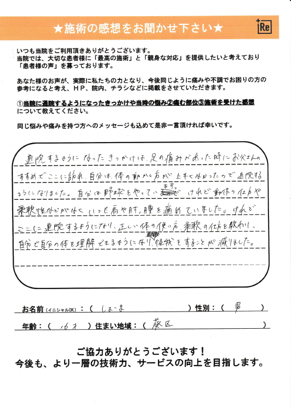 今後の施術方針や通い方、ご自宅での過ごし方、ホームエクササイズなどをアドバイスさせていただきます。